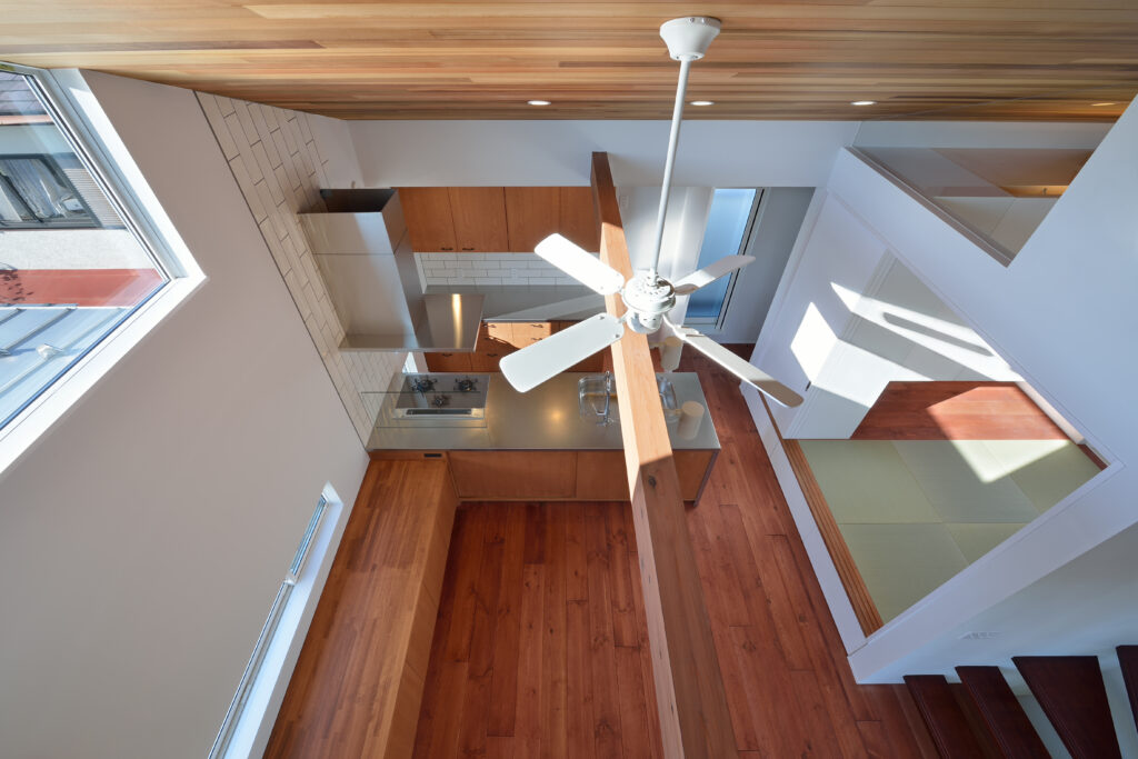 冬になれば乾燥しがちで、浴室やランドリールームで発生した湿気を、建物全体へ循環させるために吹き抜けが大きな役割を果たすのです。空気は湿気を含むと温度が下がって軽くなり、空間の上部へ流れていきますので、吹き抜け上部に設置したシーリングファンでその空気を拡散させています。