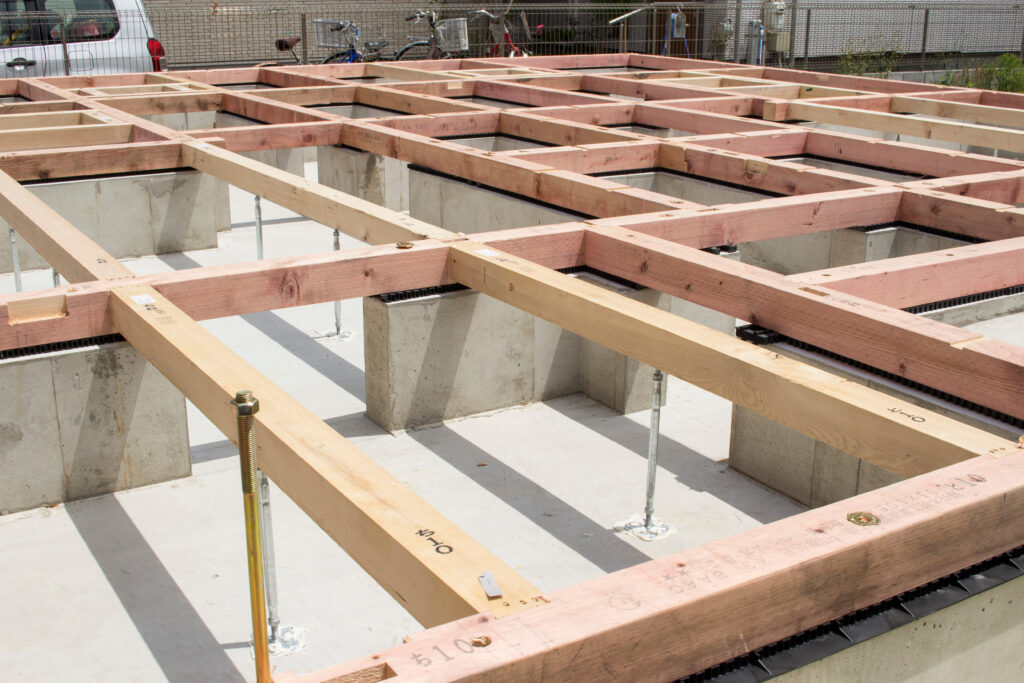 皆さんは土台や大引をご存じでしょうか。鉄筋コンクリート造の基礎上部に敷かれている角材が土台であり、基礎立ち上がりが無い部分で床束に支えられて、1階の床組みを構成する部材が大引です。特に土台は、鉄筋コンクリート造の基礎と軸組をつなぐ重要な役割を担っています。