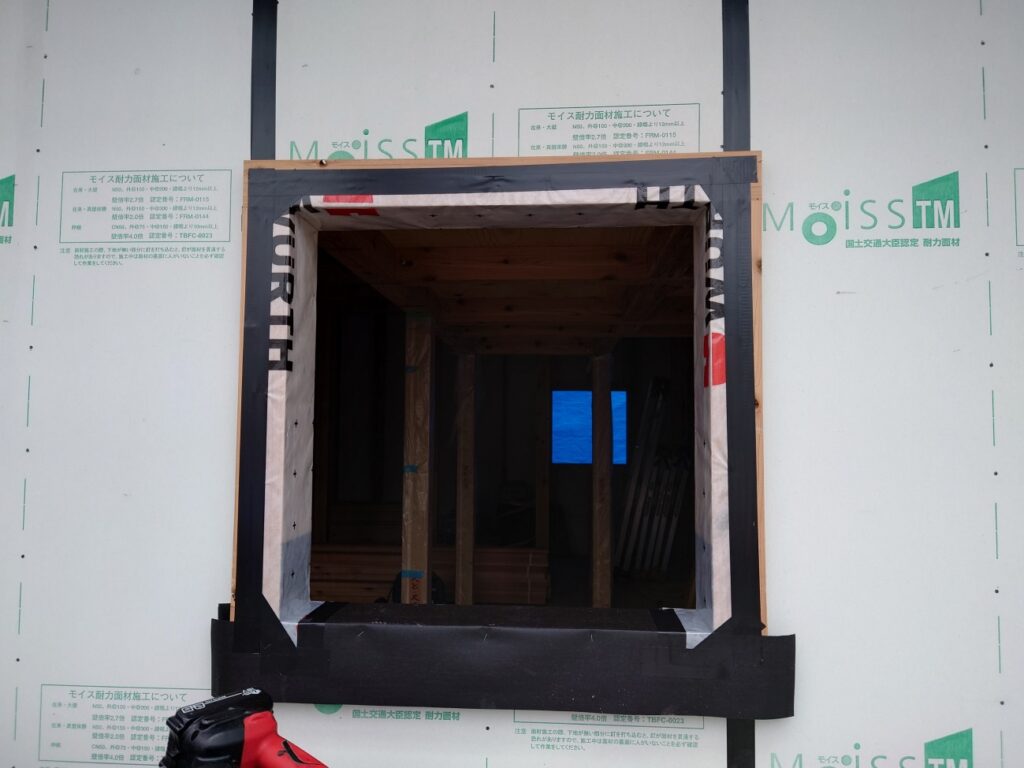 外周には、耐力面材MOISSを施工。面材同士や窓との隙間には気密テープを貼り、建物内部の気密性を高めていきます。