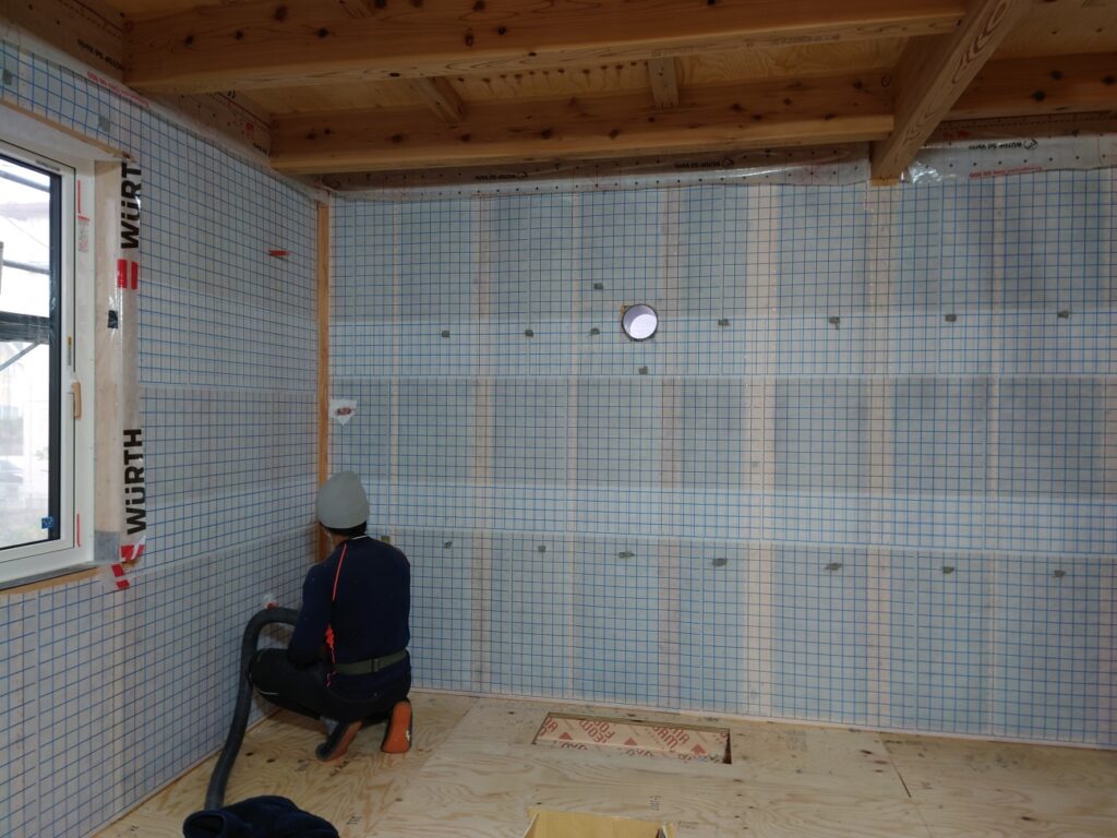 建物内部においては、セルロースファイバー105㎜を充填。外周部の断熱工事はこのように進めているのです。