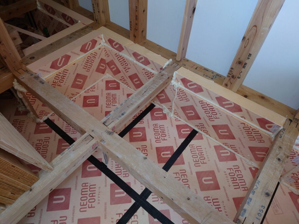 1階床や小屋部分(屋根断熱)も断熱材を配置。こうして、1階床、外壁、屋根部分が断熱材に囲まれることで、断熱性能を上げていきます。