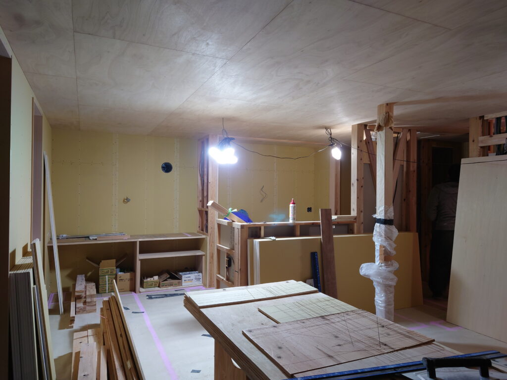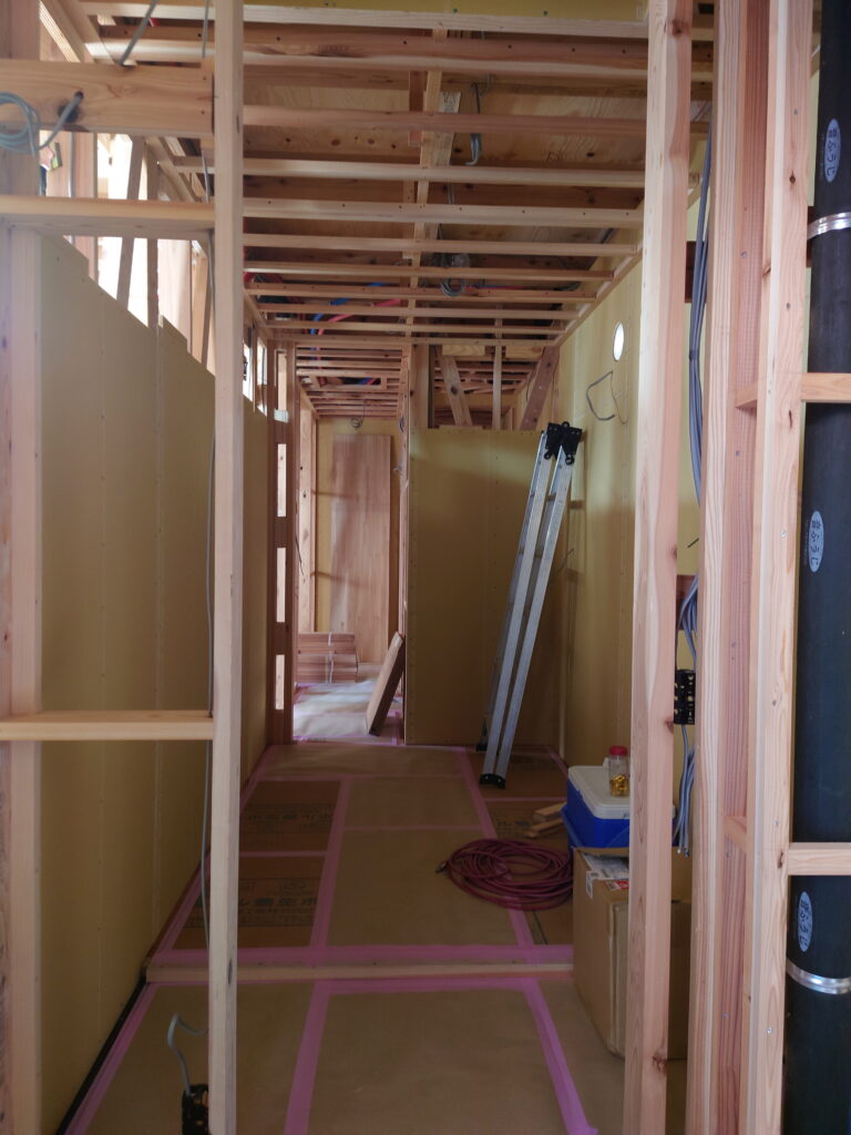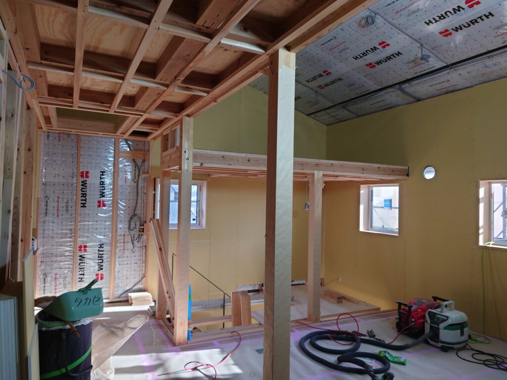 工事は内装へと移ってきました。内壁の下地材となる石膏ボードを施工していくと、少しずつ部屋の雰囲気が分かってくる頃だと思われます。