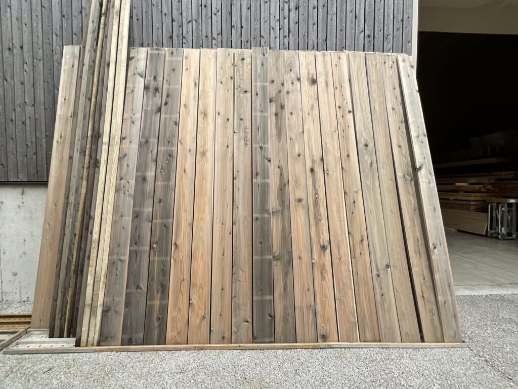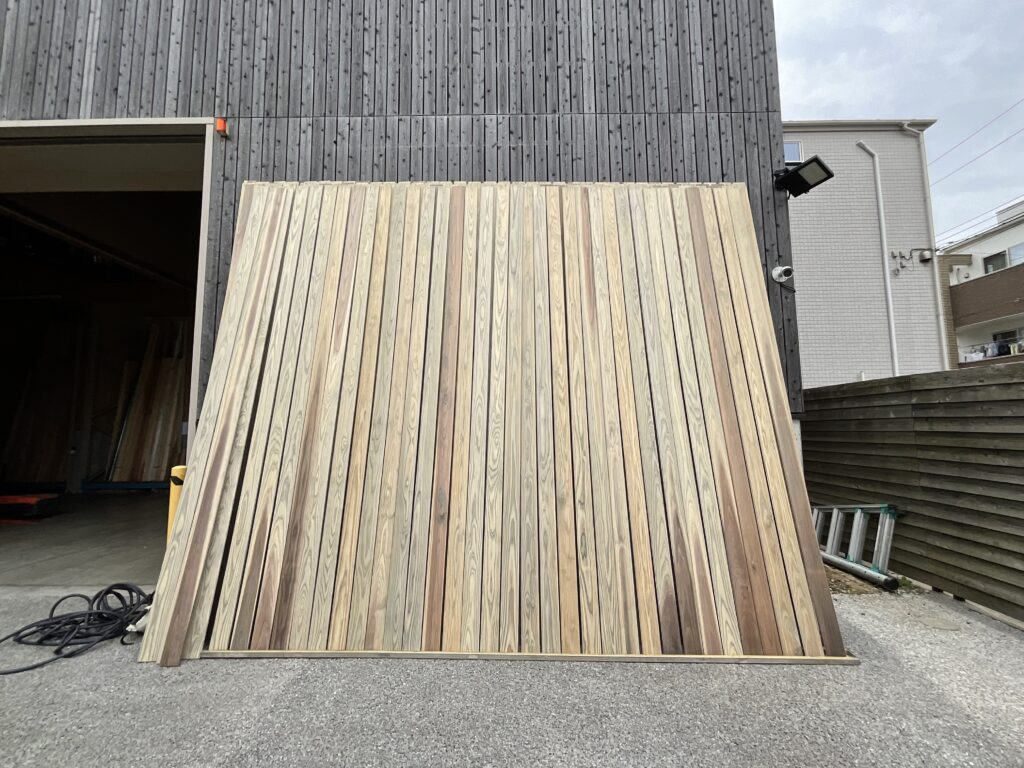 上の写真に並んでいる杉板は木材の中心に近い赤みがかった部分であり、
