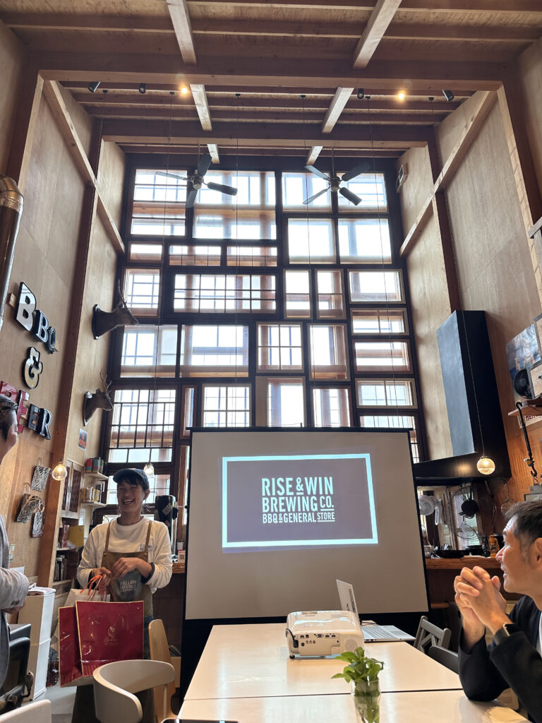 「ゼロ・ウェイストセンター」をご案内いただく前に、ちょうどお昼だった僕たちは池添さんが働かれているブルワリー(RISE & WIN Brewing Co. BBQ & General Store)で昼食をいただきながら、池添さん達の思いや、上勝町の現状と対策について拝聴し、また意見交換をいたしました。