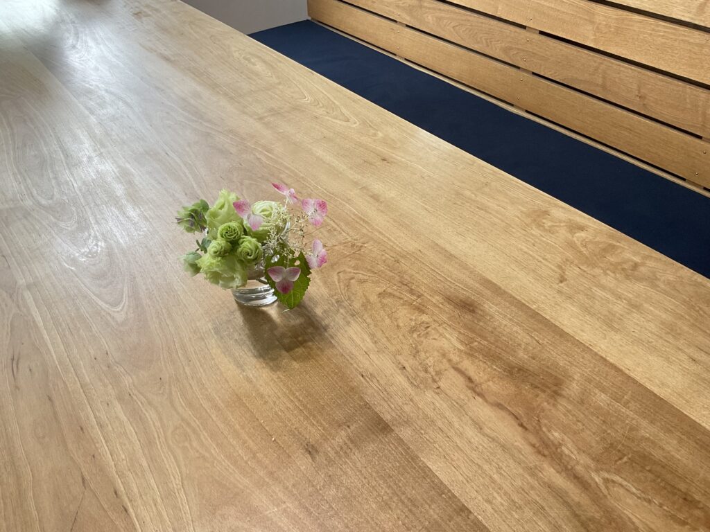 事務所のテーブルには、中庭に可憐に咲いていたヤマアジサイを。