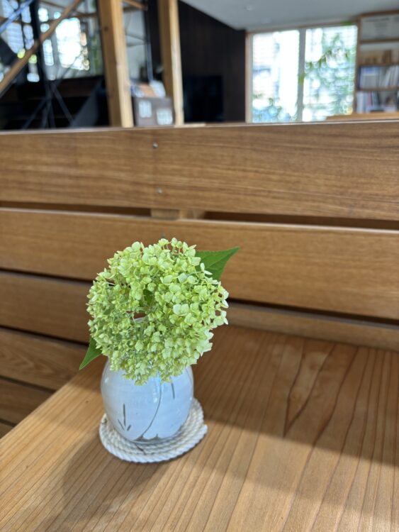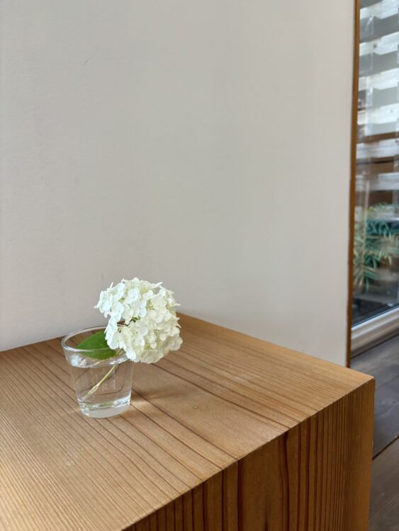 事務所の外では、雨のしずくがかかった紫陽花の仲間アナベルが明るく彩ってくれています。