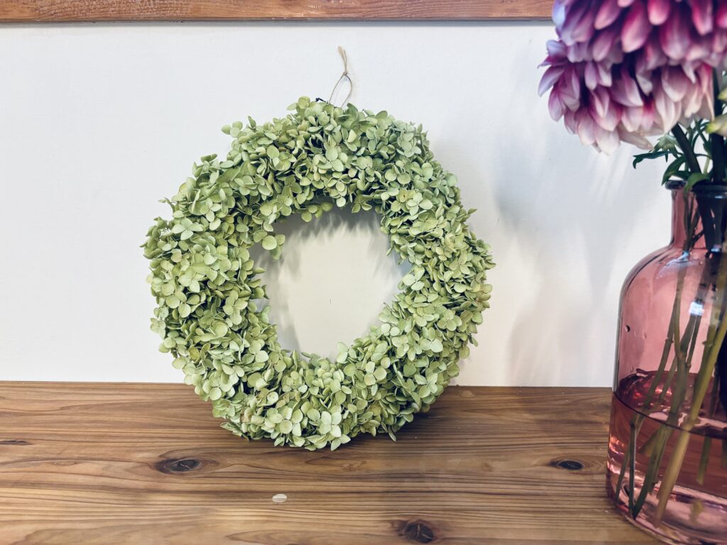 こちらは、事務所にたくさん咲いたアナベルだけでリースを。