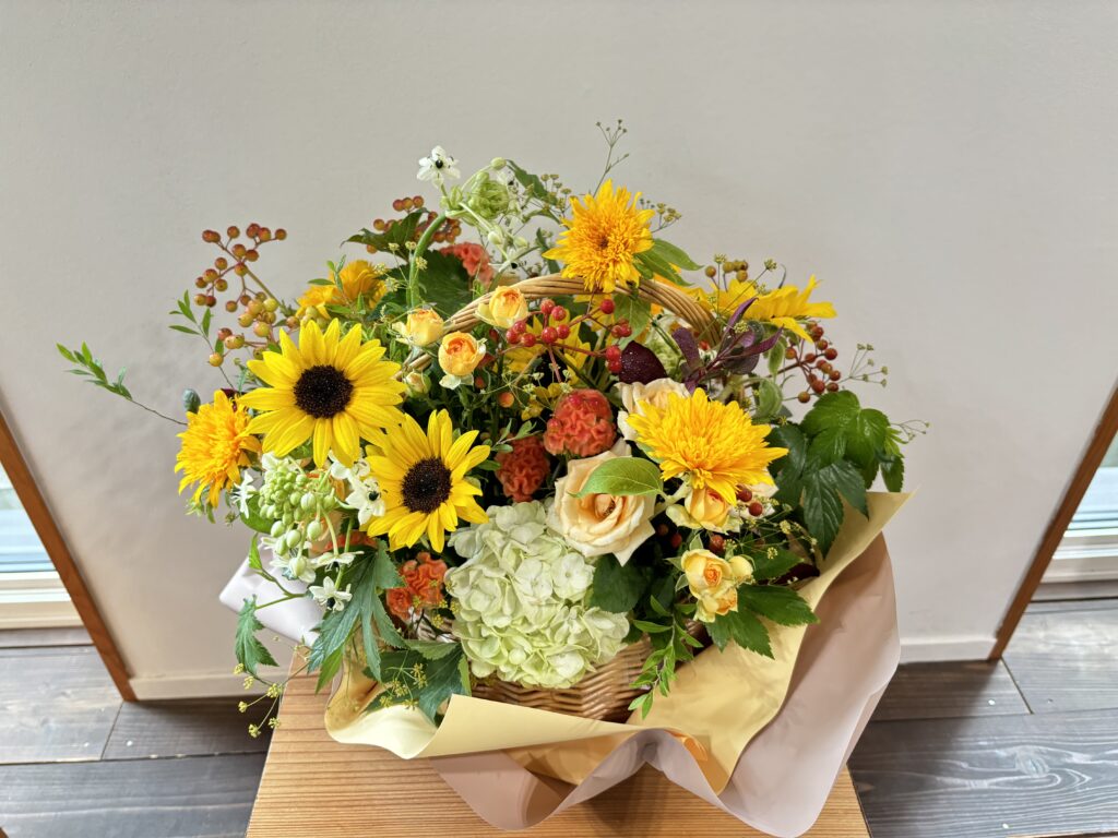 黄色系でとのご依頼だったので、季節のひまわりと可愛い実物をアクセントに明るくまとめました。