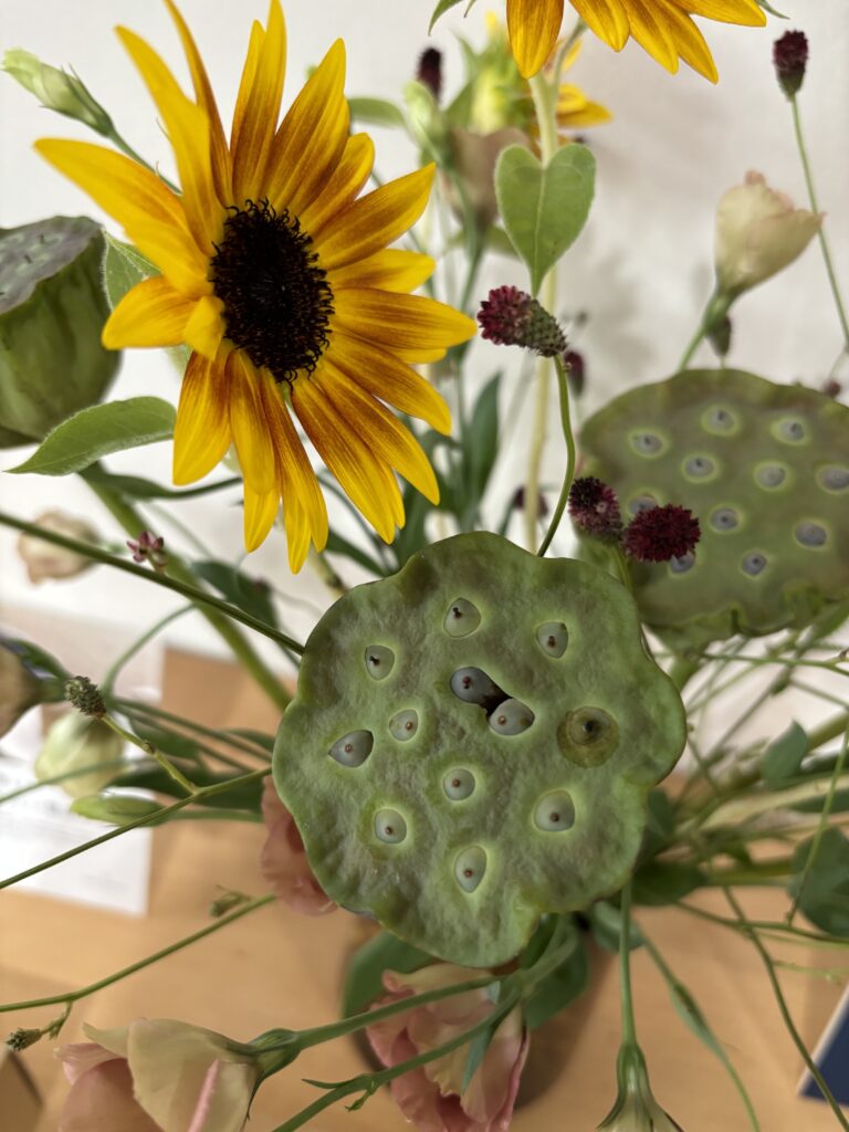 このひまわりとワレモコウ、そしてあまり見かけない形のお花?実?を飾ってみました。