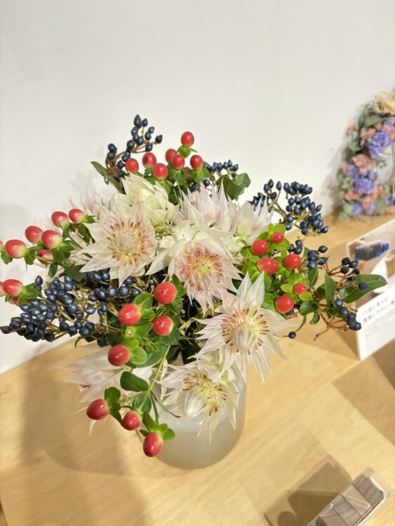 事務所のお花は、11月初めは実物と大好きなお花の組み合わせ。