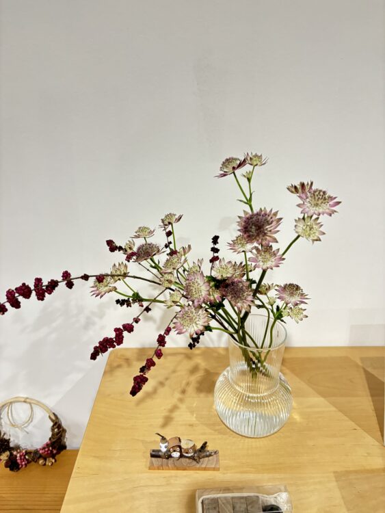 その横にこれまた大好きなお花「アストランチャ」と実物「シンフォリカルポス」でボルドーで揃えました。
