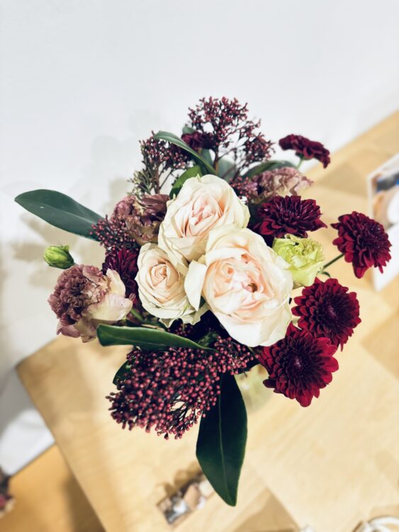 こちらは、深紅のスプレーマムと、つぶつぶのお花はスキミアという花木で、これはつぼみです。