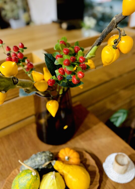 事務所内も、まだ名残惜しく秋を感じつつ、クリスマスっぽいカラーもあったり。