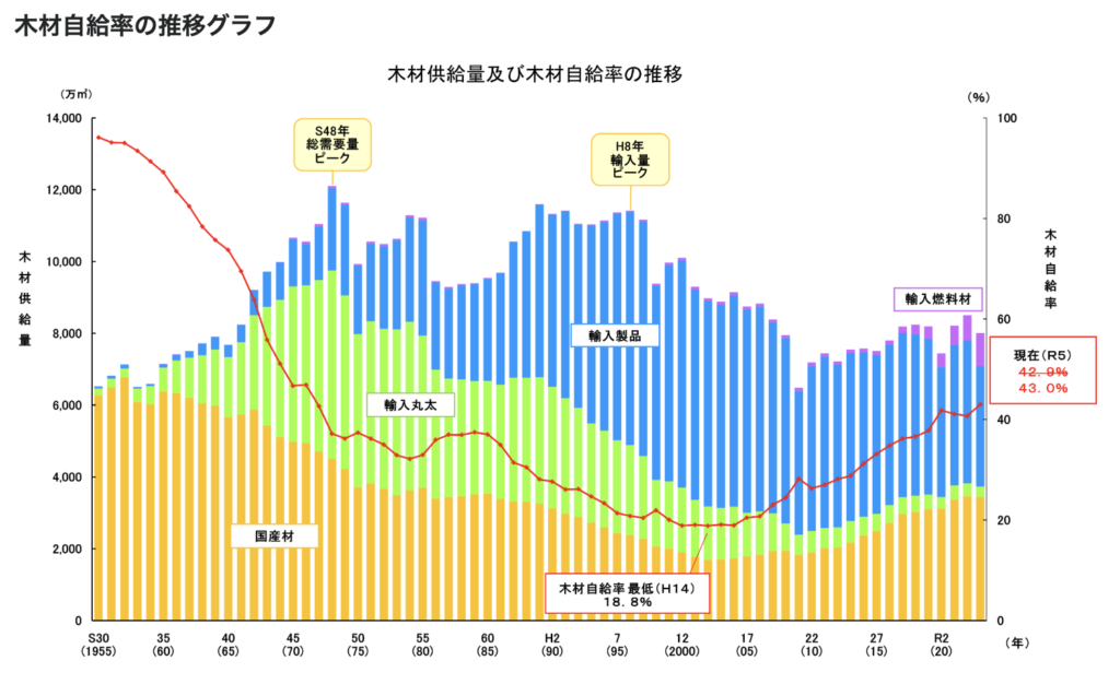 木材自給率は上昇傾向にあるものの、建築用材においては、まだまだ輸入材に依存していると言われています。