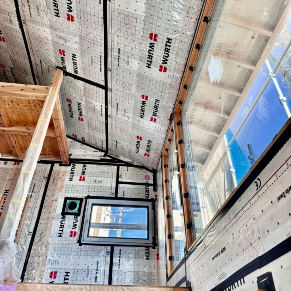 窓は世界最高クラスの木製窓「佐藤の窓」を配置。これにより、世界トップクラスの断熱仕様が実現しました。屋根断熱はネオマフォーム90㎜+セルロースファイバー150㎜充填しました。