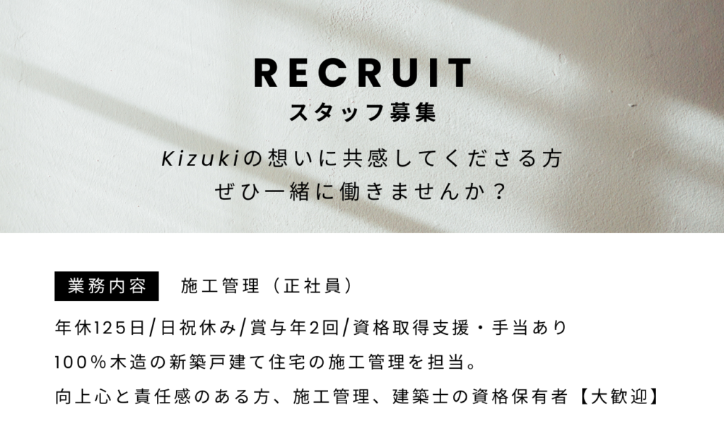 工程・原価・品質・安全・環境のすべてに責任を持ち、理想の家づくりを形にする重要な役割です。 私たちの家づくりのブランド名である「Kizuki」。