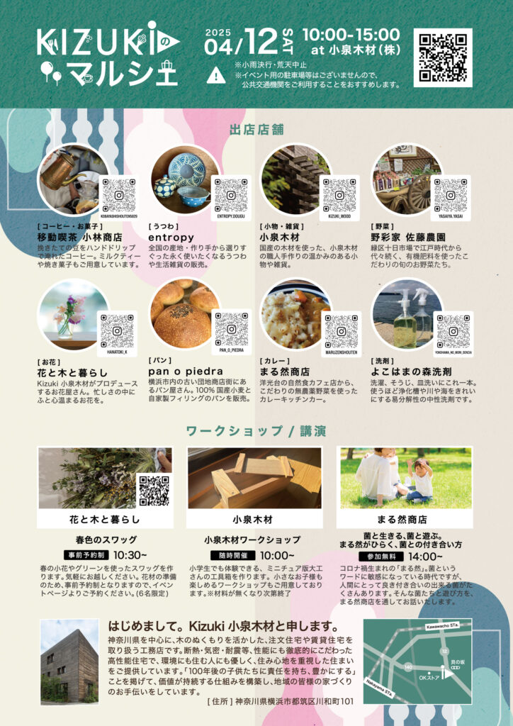『未来へつなぐ、心地よい暮らし』をテーマに、Kizukiのキーワードでもある100年後の子供たちへ、 この先も受け継いでいきたい、地域のより良い物・コト・暮らしを集めたマルシェです。 横浜エリアの素敵な商店様に集まっていただき、皆様に楽しんでいただける 魅力的なラインナップになったと思っております! このイベントと通じて、地元の素敵な物を皆様と共有できる時間になると嬉しいです。 ぜひお気軽にご来場ください。
