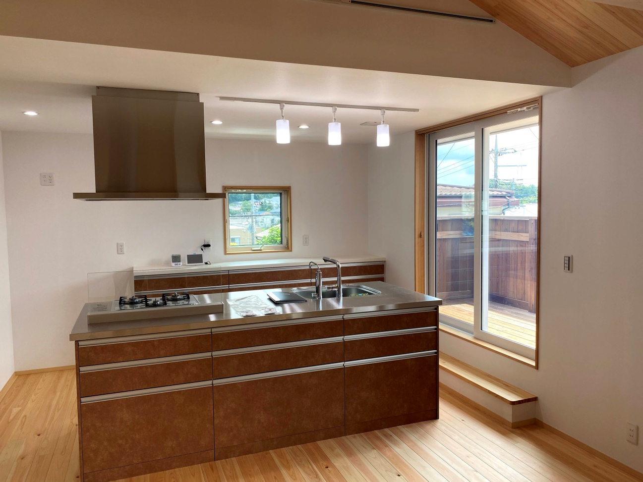 アイランドキッチン経由のバルコニーから星が見える家