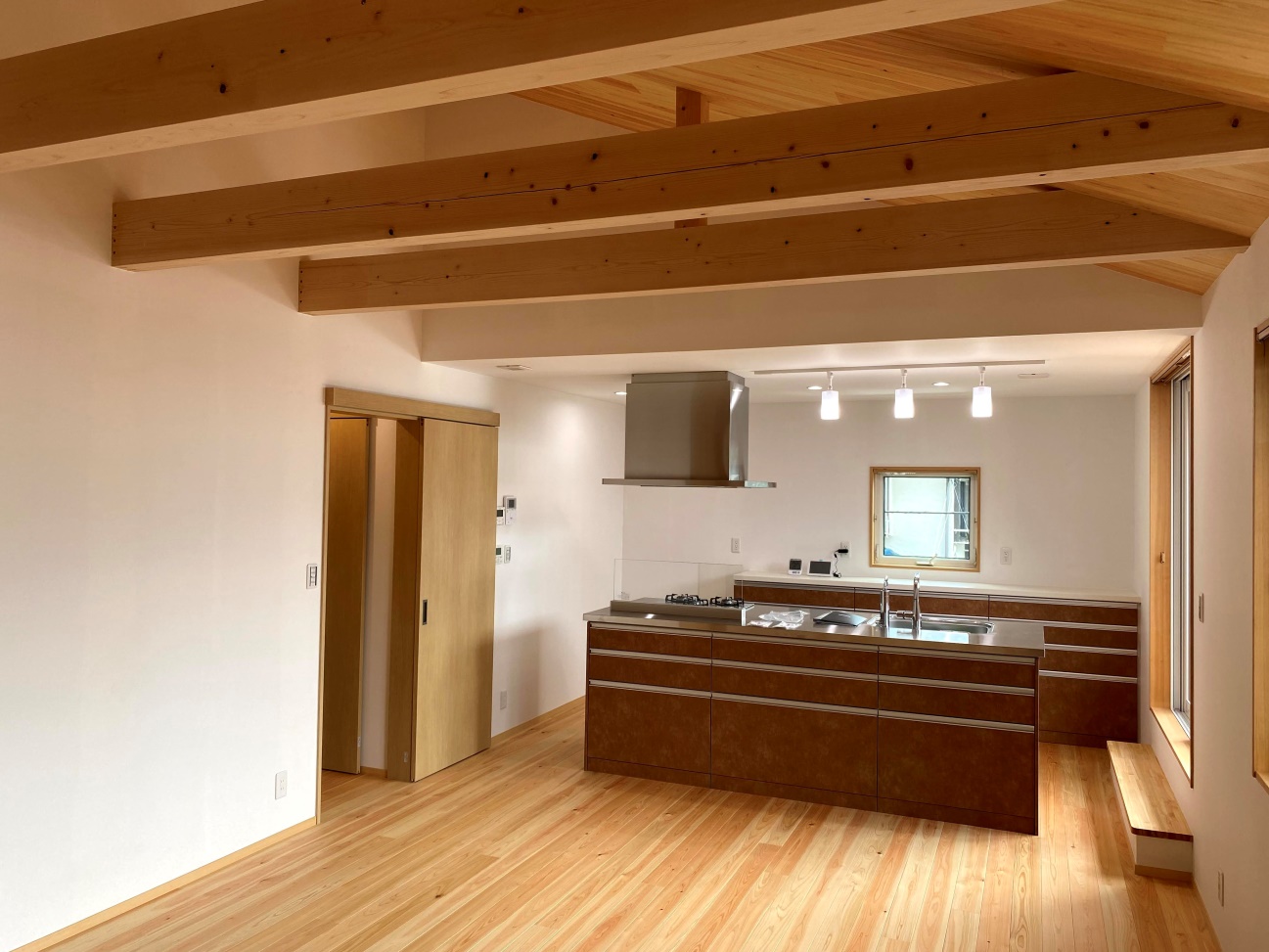 また、外部とのつながりにおいても、太陽光を取り入れる時間帯や窓の配置を考慮し、設計・施工をおこないました。