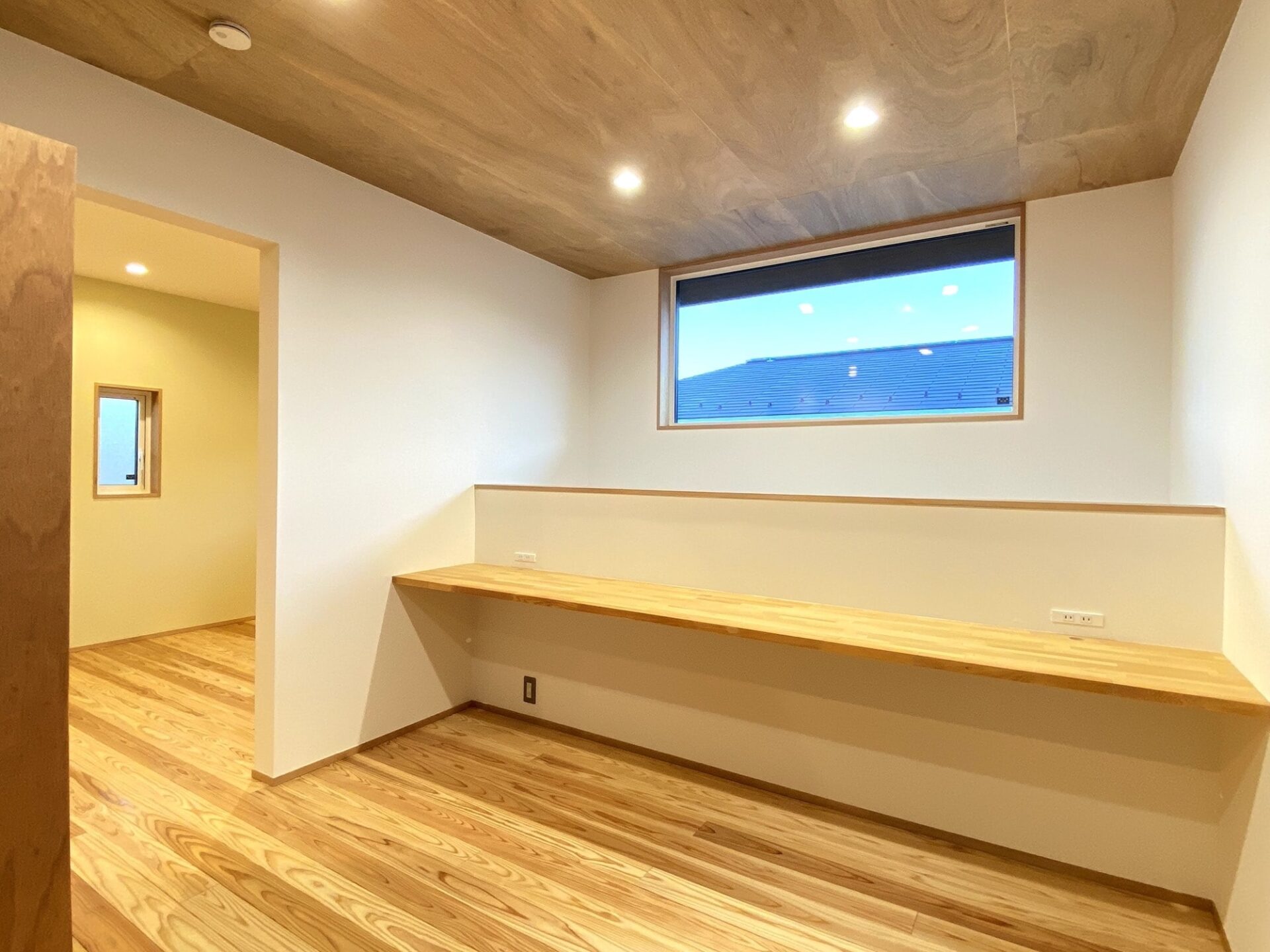 建物としては、外壁をガルバリウム鋼板横葺きとし、内観ではLDKと窓、LDKと吹き抜けやワークスペースの関係性を中心にデザインしました。A様は二世帯住宅を希望されていて、お子さまもいらっしゃいますので、世帯間のつながり方を重視しました。