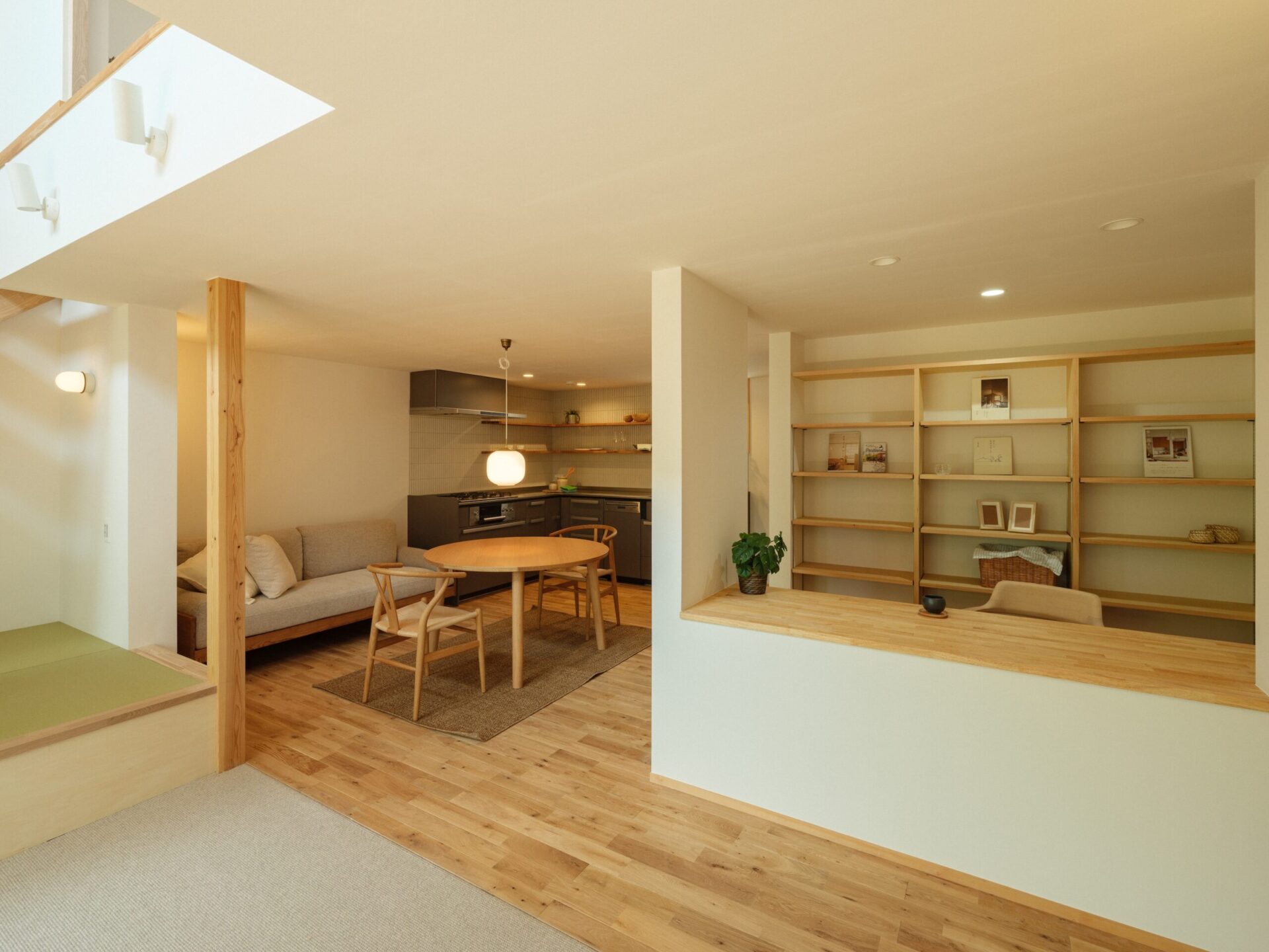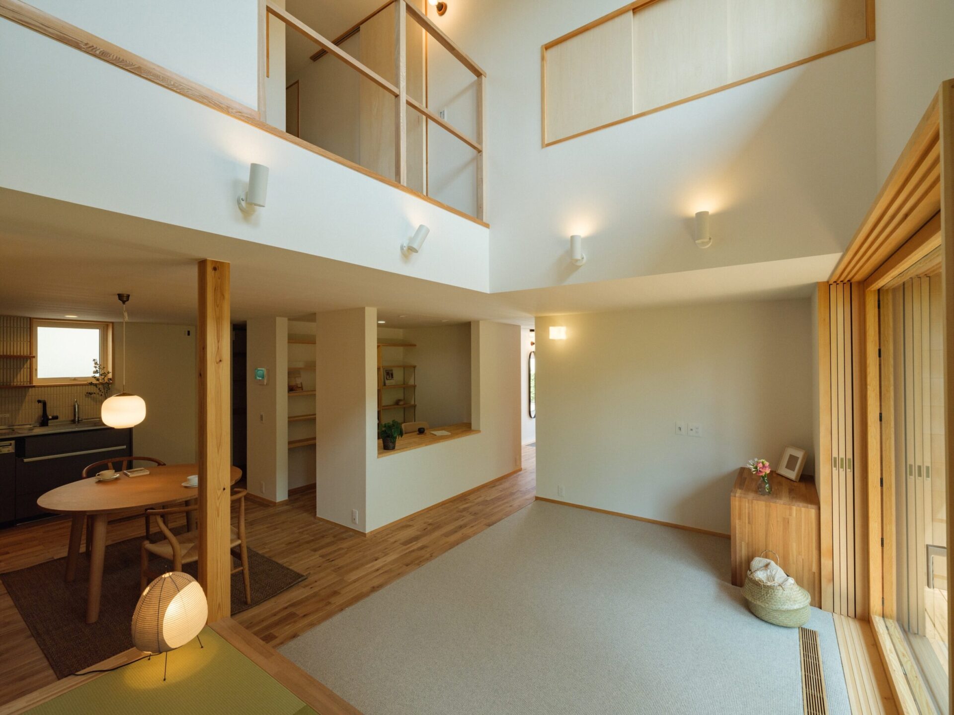 障子越しに柔らかな光が差し込むリビングは、小上がりや堀田カーペットが、和の趣とくつろぎの空間を演出し、お施主様のセンスが光る調和のとれた和モダンな空間となっています。