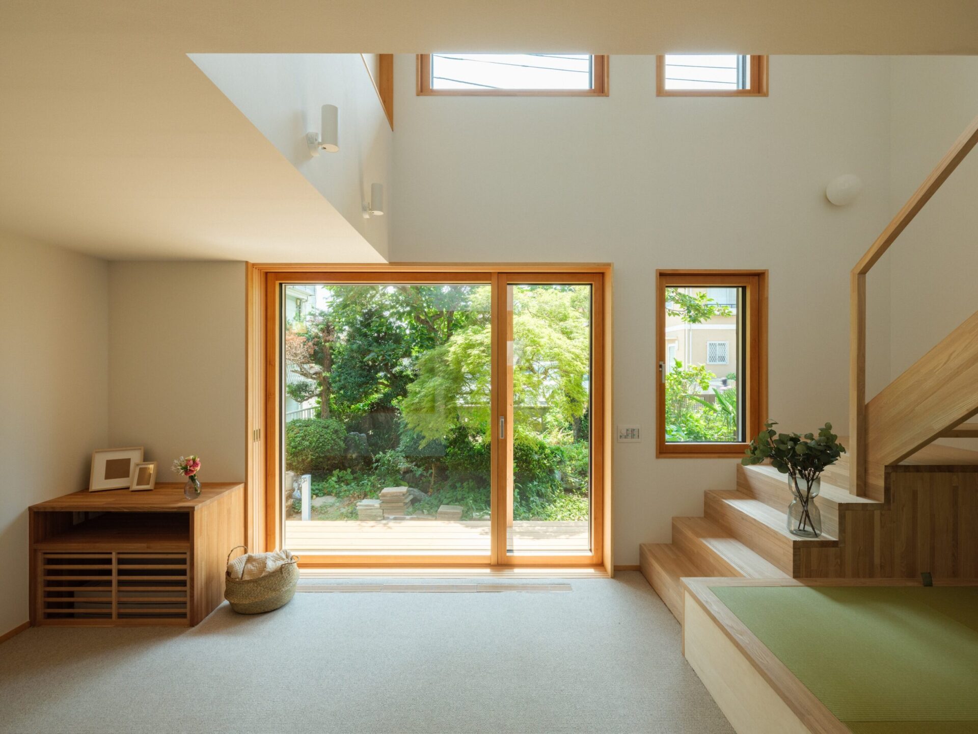 透明度が高く断熱性に優れたこの窓は、冬の低い日差しを効果的に採光し、お庭の四季の移ろいも室内に美しく映し出してくれます。