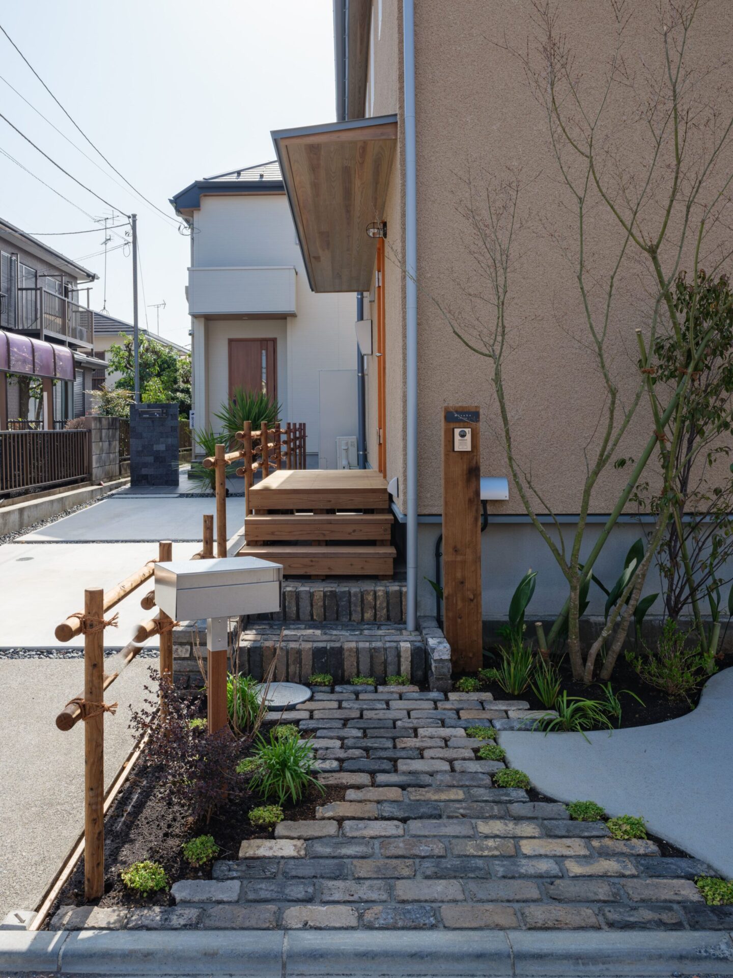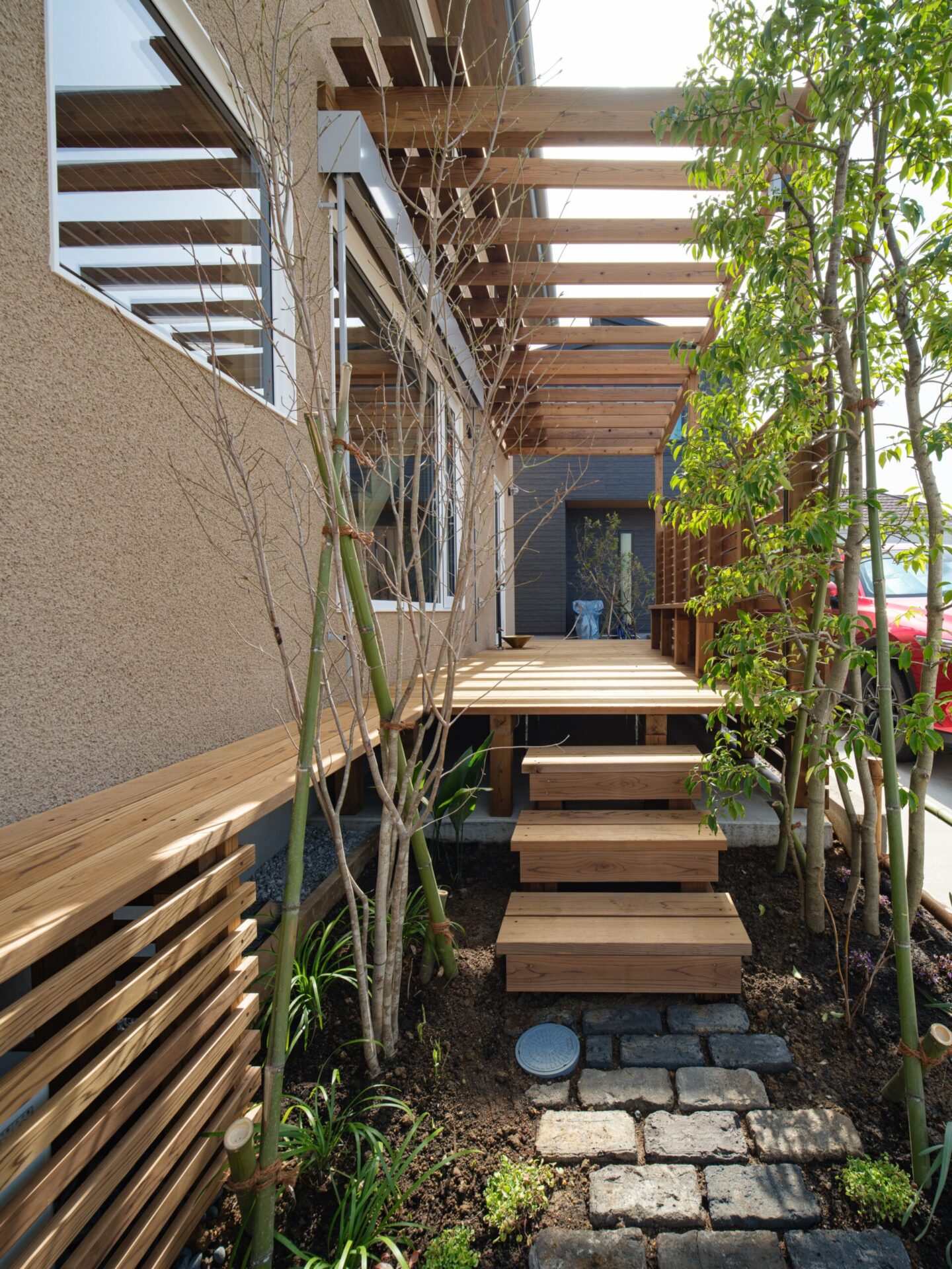 自宅周辺から視線を遮るための木塀と日射を抑えるバーゴラを配置することで、周囲との距離感を確保し、目線をつなげるための植栽を置くことにより、自宅の内外部とのつながりを演出しています。