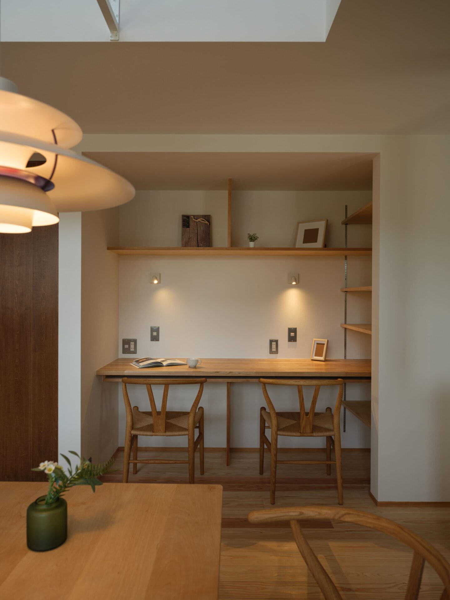 リビングダイニングにはワークスペースも配置し、リモートワークやお子さまの勉強できるスペースにもなっています。その上部は吹き抜けとしたことで、外部からの光を取り入れるとともに、建物全体の空調を機能させる大切な空間としました。