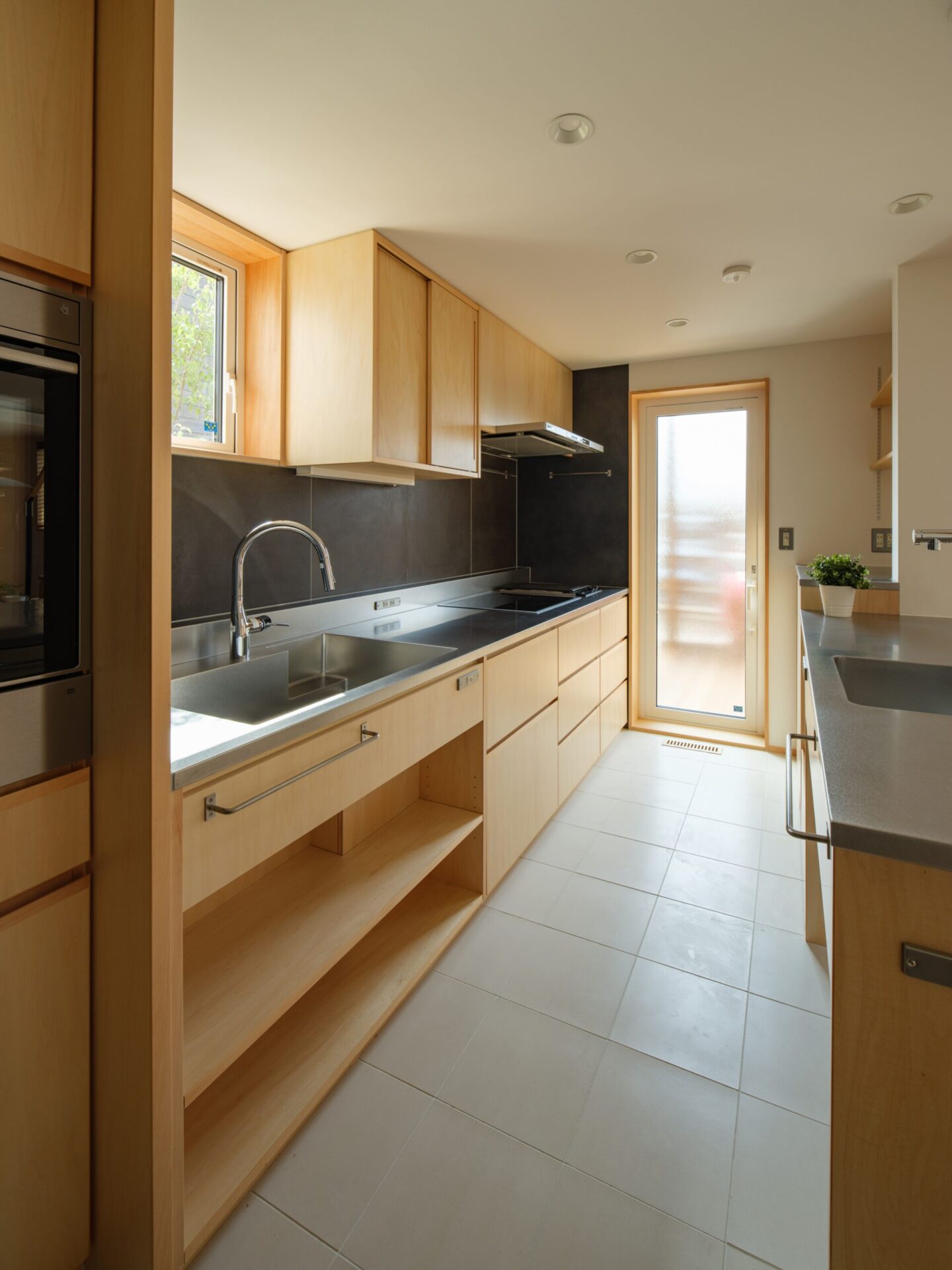 ご主人が大の料理好き。加熱調理機器を3種類(IH、電気BBQグリル、電気オーブン)、他にも複数の調理器具を所有されていたため、キッチンには大変なこだわりを持たれていました。家族にも料理を振る舞っていますので、造作キッチンには大いに憧れを持っていて、ご主人とは家具図を前に詳細な打ち合わせを何度も重ねてきました。