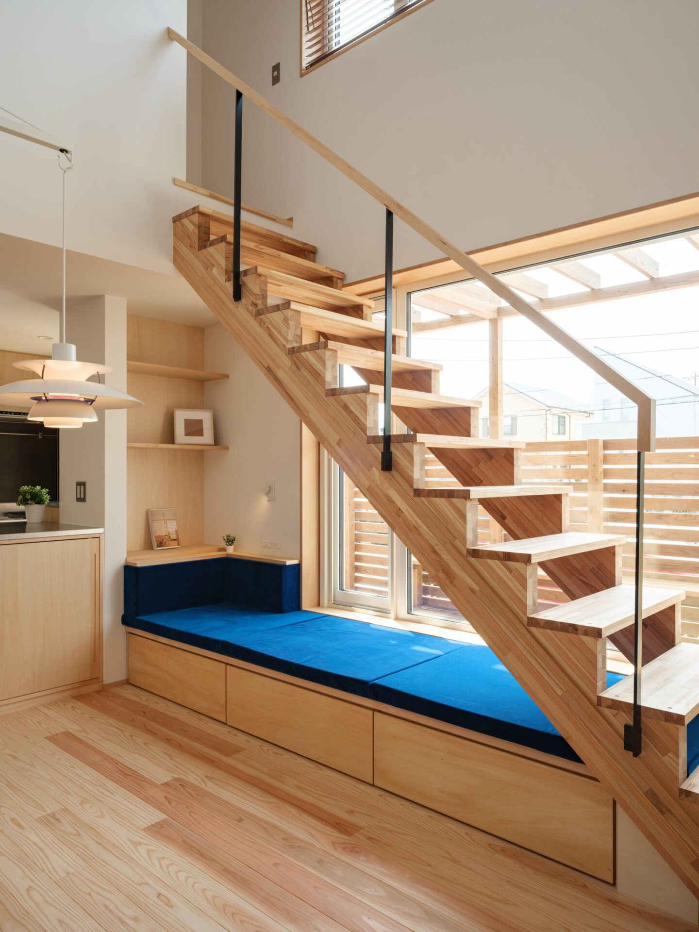 キッチンの近くには、こだわり抜いたリビングダイニングがあります。そこでは、本を読んだり、お酒を楽しむことができます。また、隣にある階段との関係性や造作ソファの製作に配慮しながら、窓の大きさや植栽にも工夫を凝らしました。リビングダイニングは、部屋内と外部をつなげる中間領域の役割を果たしています。