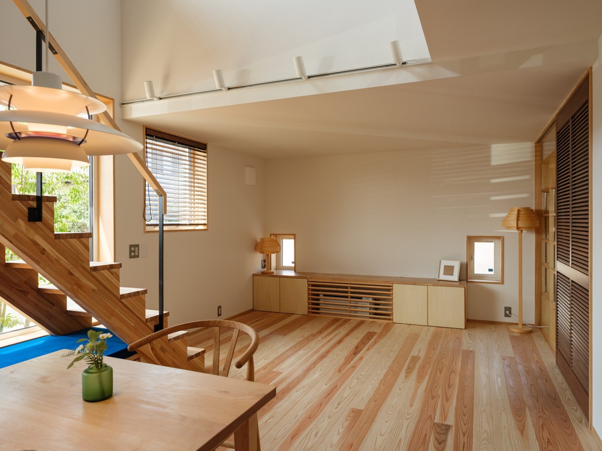 リビングダイニングにはワークスペースも配置し、リモートワークやお子さまの勉強できるスペースにもなっています。その上部は吹き抜けとしたことで、外部からの光を取り入れるとともに、建物全体の空調を機能させる大切な空間としました。